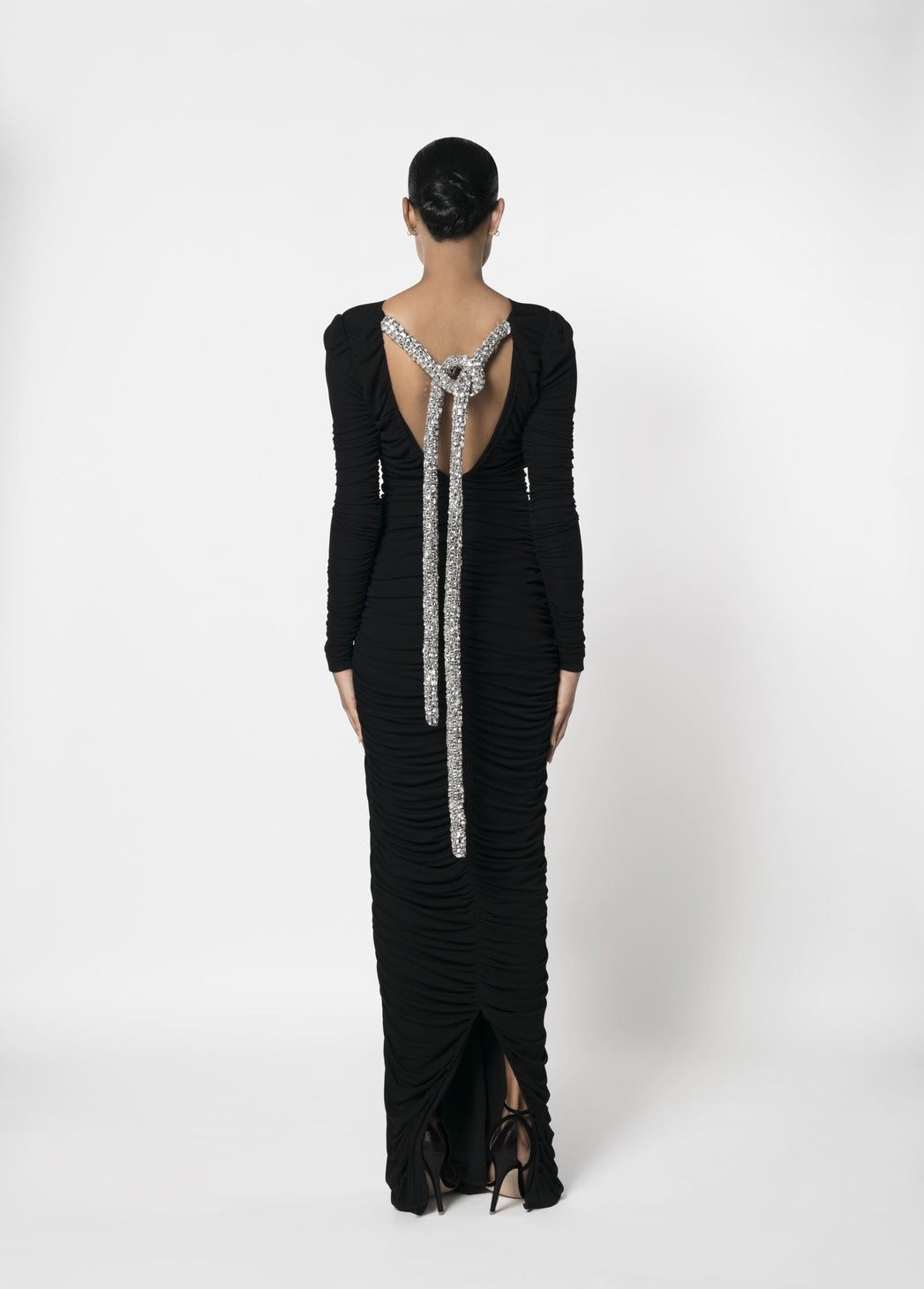 - BLACK RAYON MATTE JERSEY GOWN, HAND DRAPED, OPEN BACK, HAND EMBROIDERED ROPE, 100% RAYON MATTE JERSEY LINING.